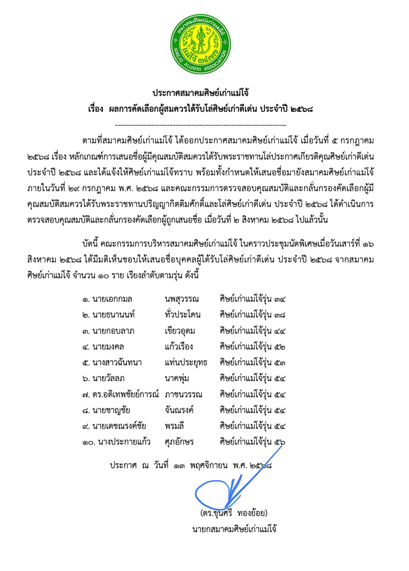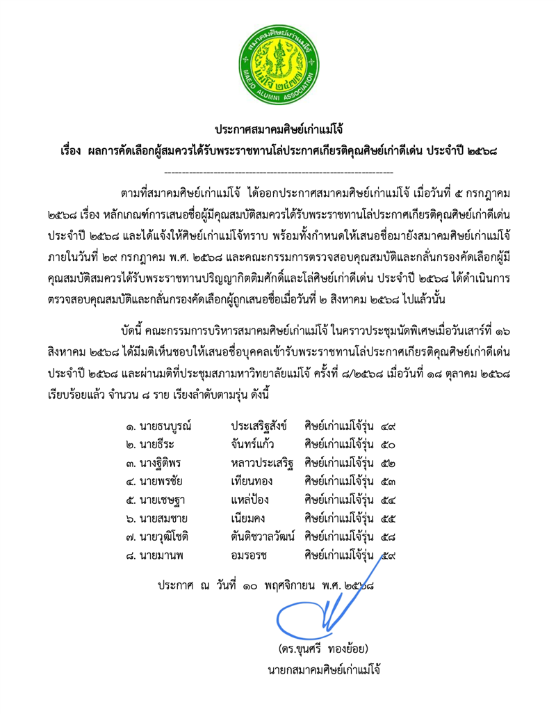 1) ผู้สมควรได้รับพระราชทานโลกประกาศเกียรติคุณศิษย์เก่าที่เด่นประจำปี 2568 ผู้ได้รับการพิจารณาตามหลักเกณฑ์ของสมาคมฯ และได้รับความเห็นชอบจากสภามหาวิทยาลัยแม่โจ้