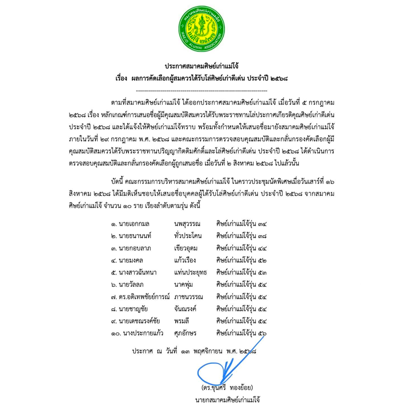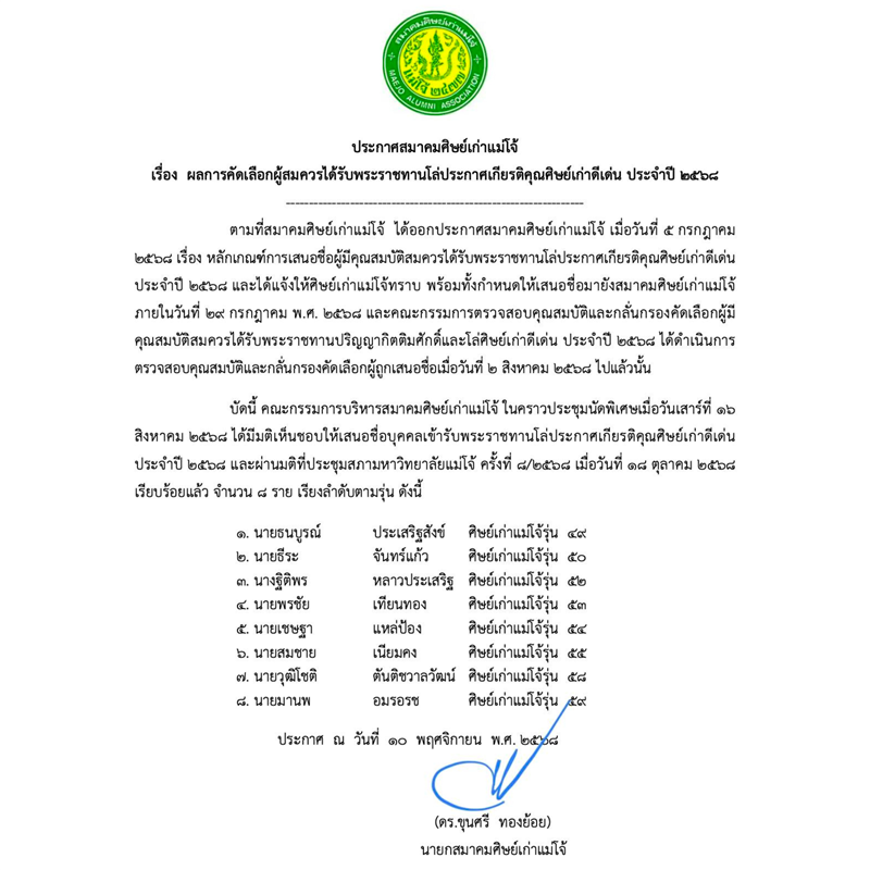 1) ผู้สมควรได้รับพระราชทานโล่ประกาศเกียรติคุณศิษย์เก่าที่เด่นประจำปี 2568 ผู้ได้รับการพิจารณาตามหลักเกณฑ์ของสมาคมฯ และได้รับความเห็นชอบจากสภามหาวิทยาลัยแม่โจ้