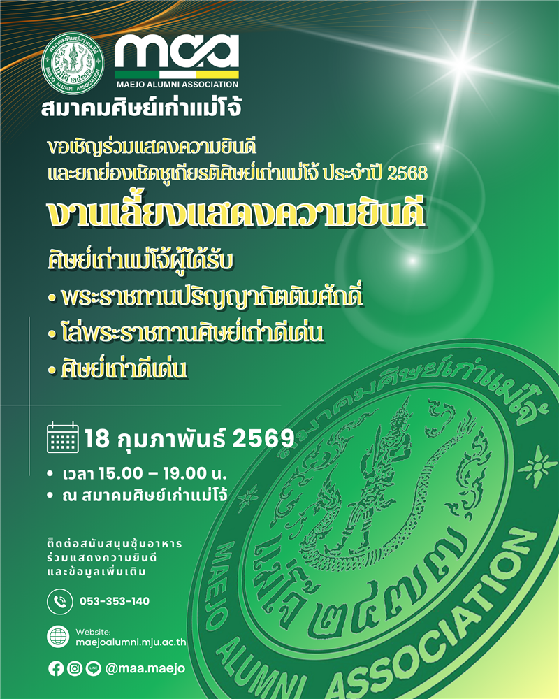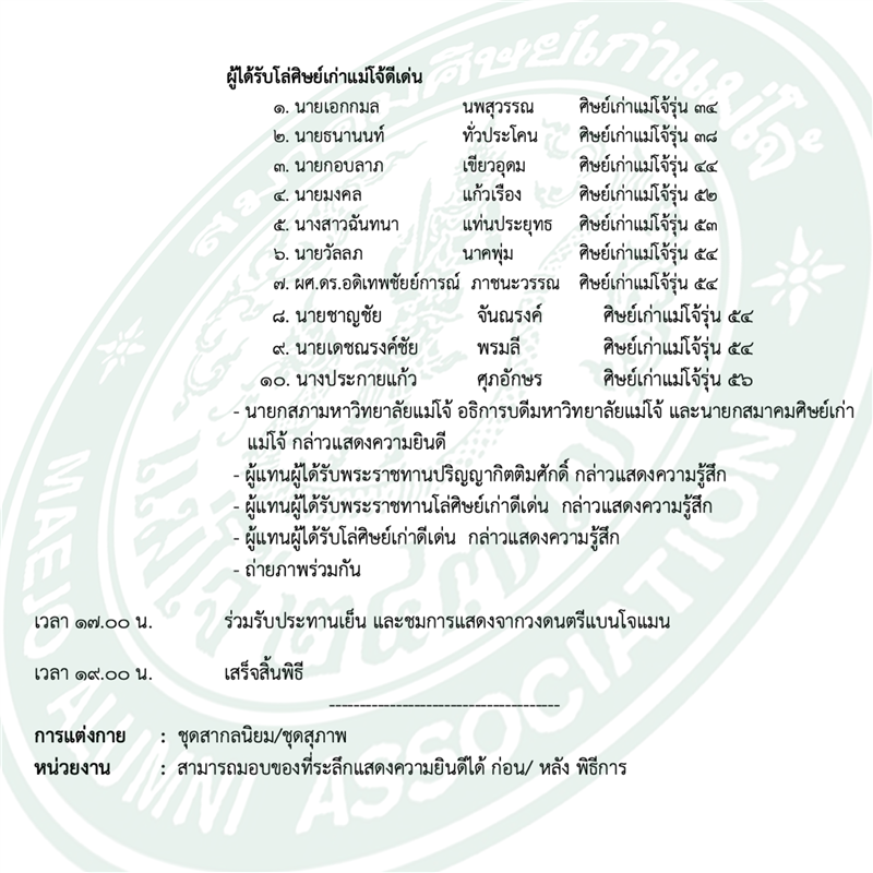 จึงขอเรียนเชิญทุกท่านเข้าร่วมงานตามวัน เวลา และสถานที่ดังกล่าวเพื่อร่วมแสดงความยินดีและเป็นกำลังใจแก่ศิษย์เก่าแม่โจ้ร่วมกัน